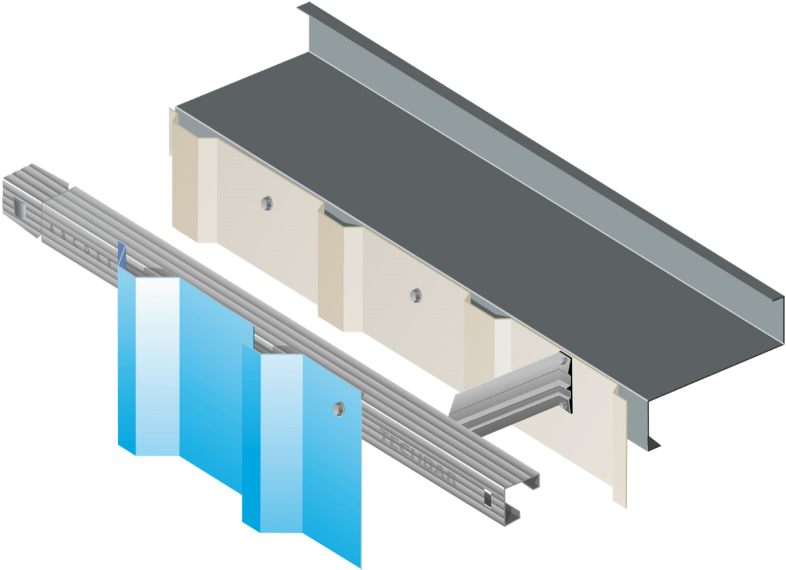 Note: For sheeting rail centres up to 1800mm, the GL Techbar system can be fitted as illustrated but attention must be paid to loads and deflections. Contact our technical department for further information regarding spacing of the GL Techbar.