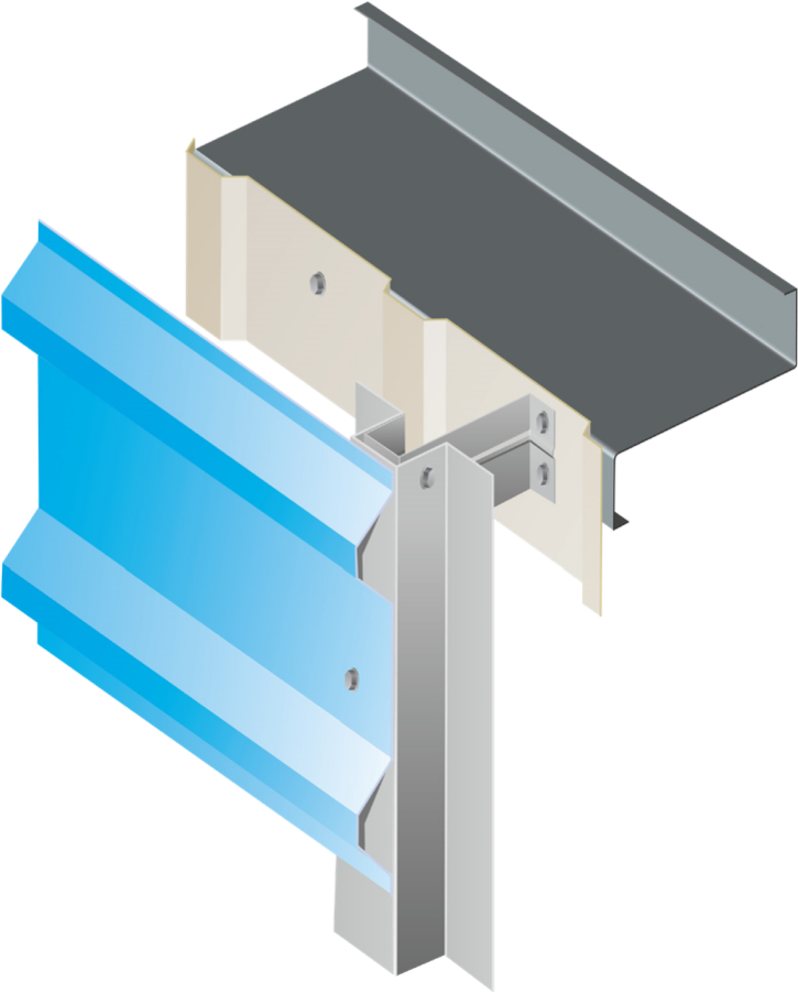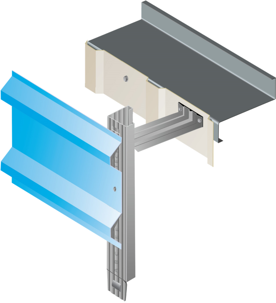 ​We have also developed an innovative top-hat system for spanning vertically across the cladding rails to support horizontal sheeting. These vertical bars can be made continuous by using splice joints. The top-hats are fixed on to bespoke TechWall Brackets with two self drilling fasteners (one per side). The TechWall Brackets are then fixed to the sheeting rail with two or more self drilling fasteners. This detail superbly distributes vertical load over all the sheeting rails. The TechWall vertical top-hat system provides excellent structural performance. With a general wind loading of 1kN/m2 and typical rail centres of 1800mm, the TechWall system requires vertical top-hats at 1400mm c/c.